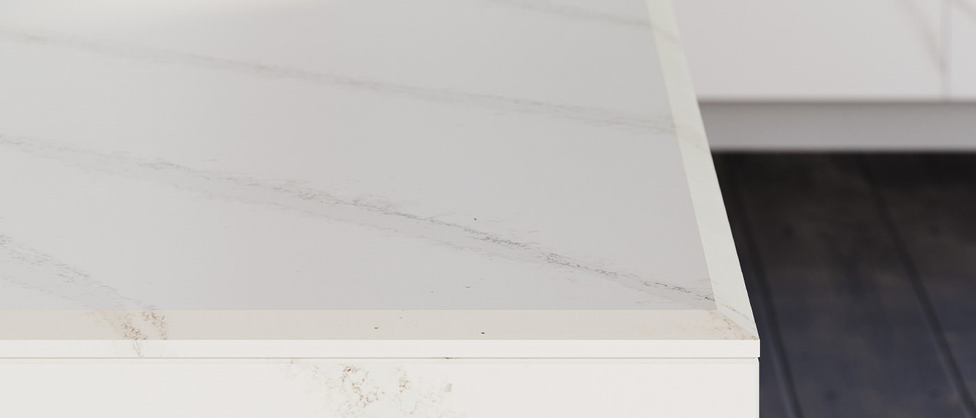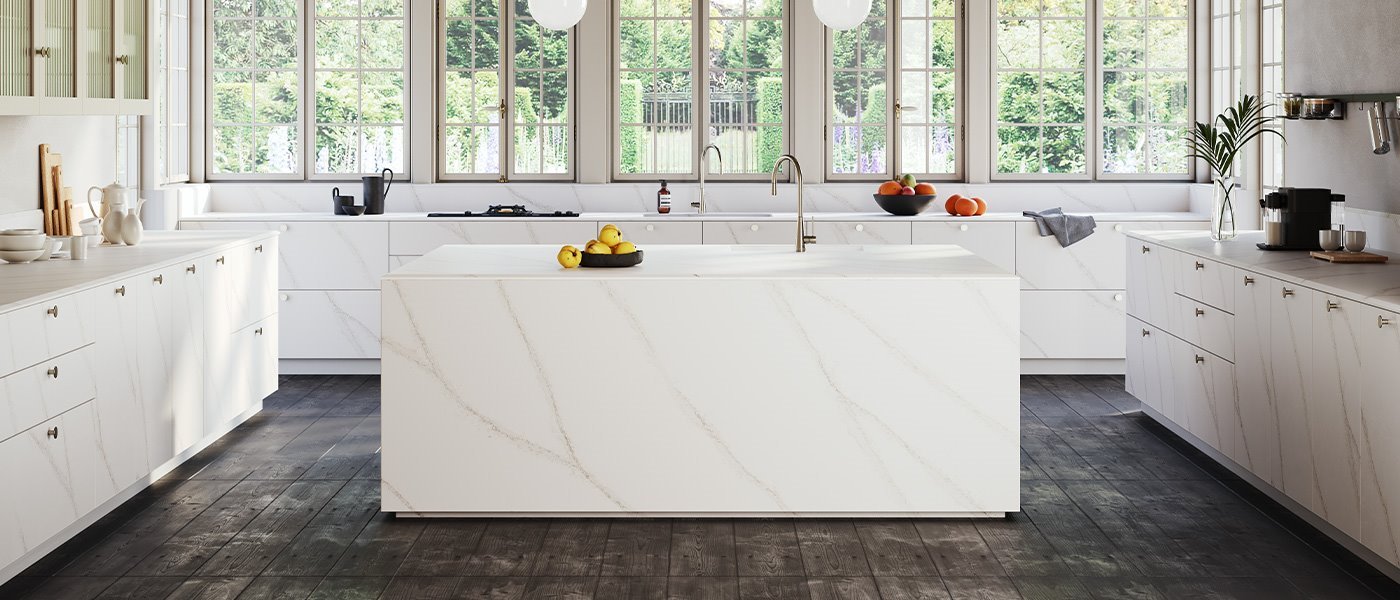 A pure, white Bianco Assoluto base and geometric veins in light grey cut the XXL format of the slabs in two, giving rigour and consistency.